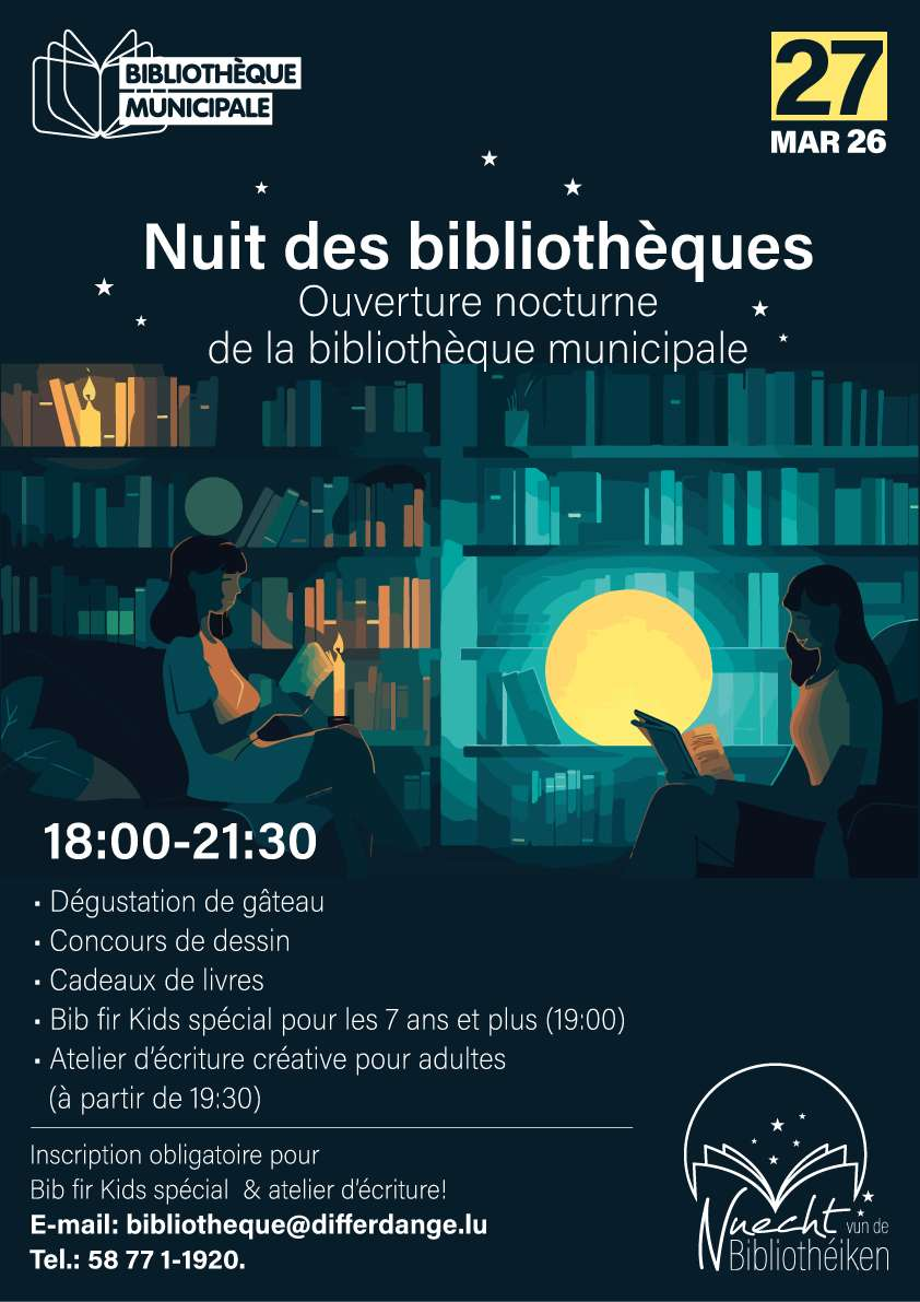 À l’occasion de la Nuit des bibliothèques, la bibliothèque municipale de Differdange vous invite à une soirée conviviale et pleine de surprises.
